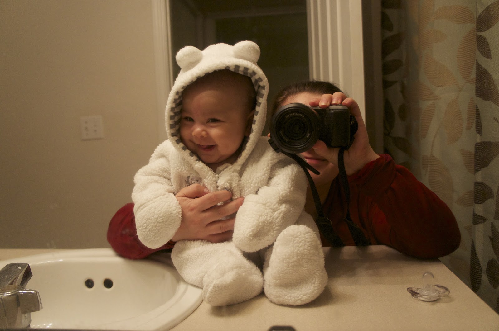 By now, I've picked up a few tricks as to what works with Addy and what doesn't. One of the most effective tricks to calming her down is taking her to look in the bathroom mirror. She loves it. She is already pretty generous with her smiles, but she seems to reserve the biggest, best ones for herself. I don't know if she has connected the fact that what she is looking at is her, or if she is just practicing her cuteness, but it works without fail almost every time. I got a few of them on camera, but they don't do justice to how big or how awesome they are.
